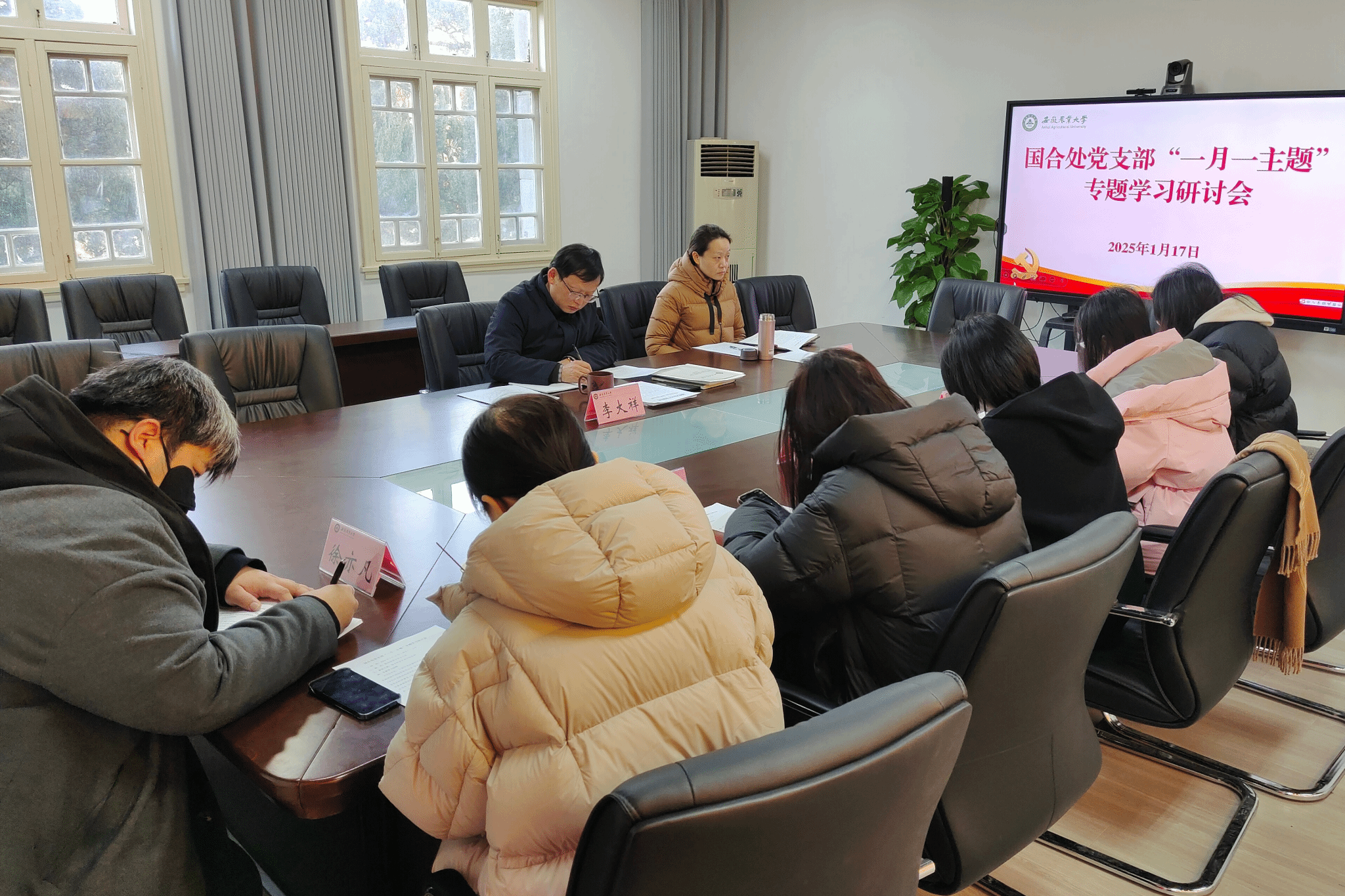 2025年1月17日上午,国合处党支部开展“一月一主题”专题学习研讨会,党支部书记李大祥同志主持会议。