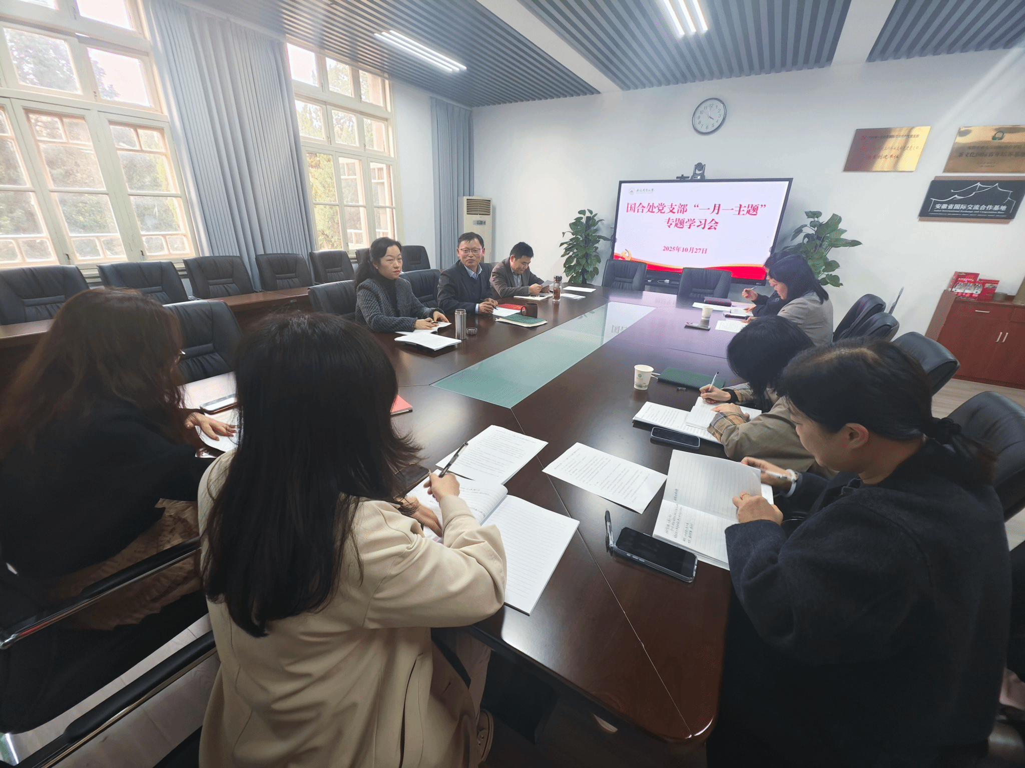 10月27日下午,国合处党支部在勤政楼国合处会议室召开“一月一主题”专题学习会。会议由党支部书记李大祥主持,国合处副处长丁惠和马超列席会议。