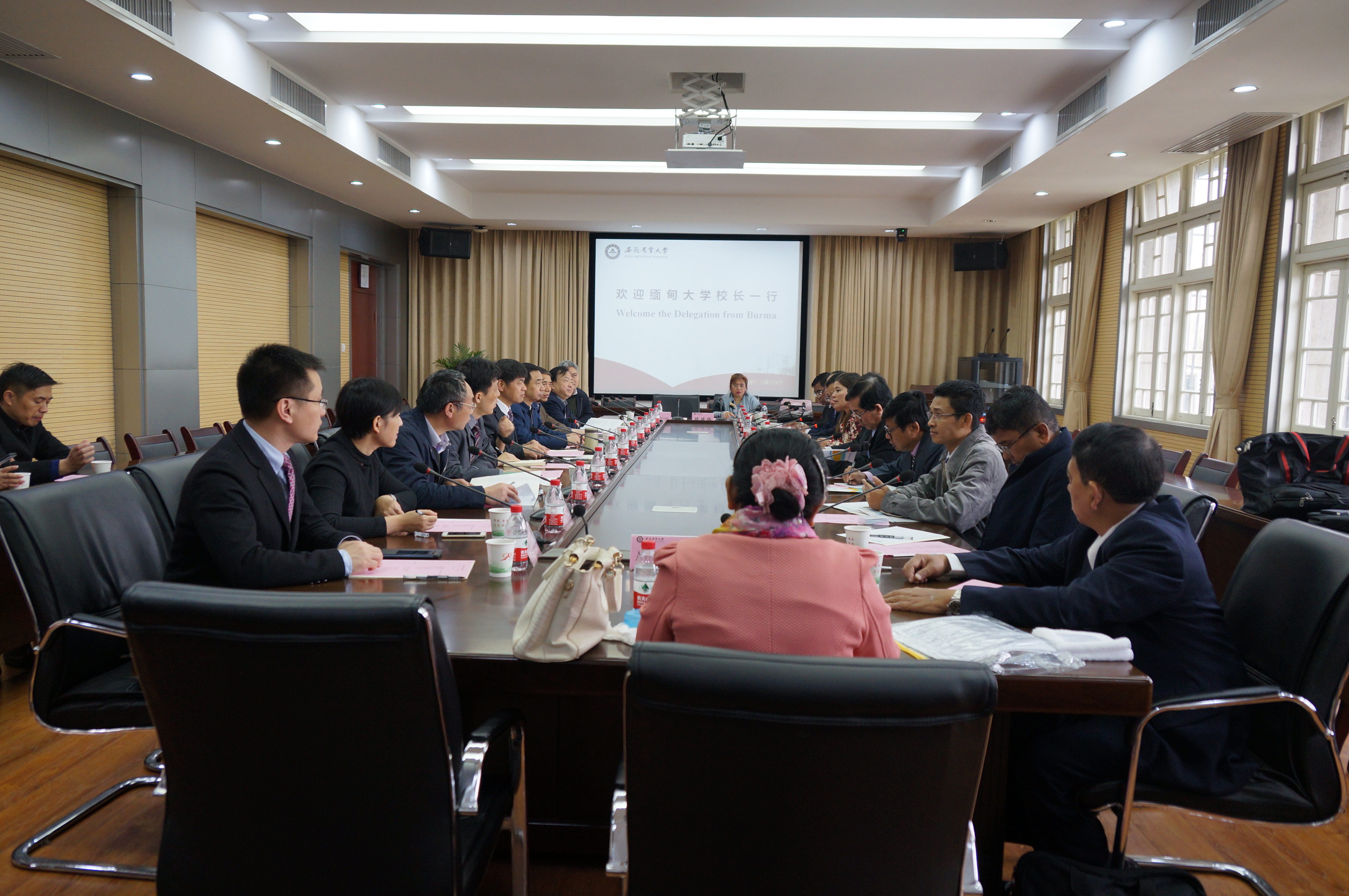 3月29日上午,缅甸原科技部技术促进和协调司司长、曼德勒计算机大学校长吴觉刷梭率领缅甸大学校长代表团一行13人在安徽省侨联党组成员、副主席兼秘书长杨冰等的陪同下访问我校。