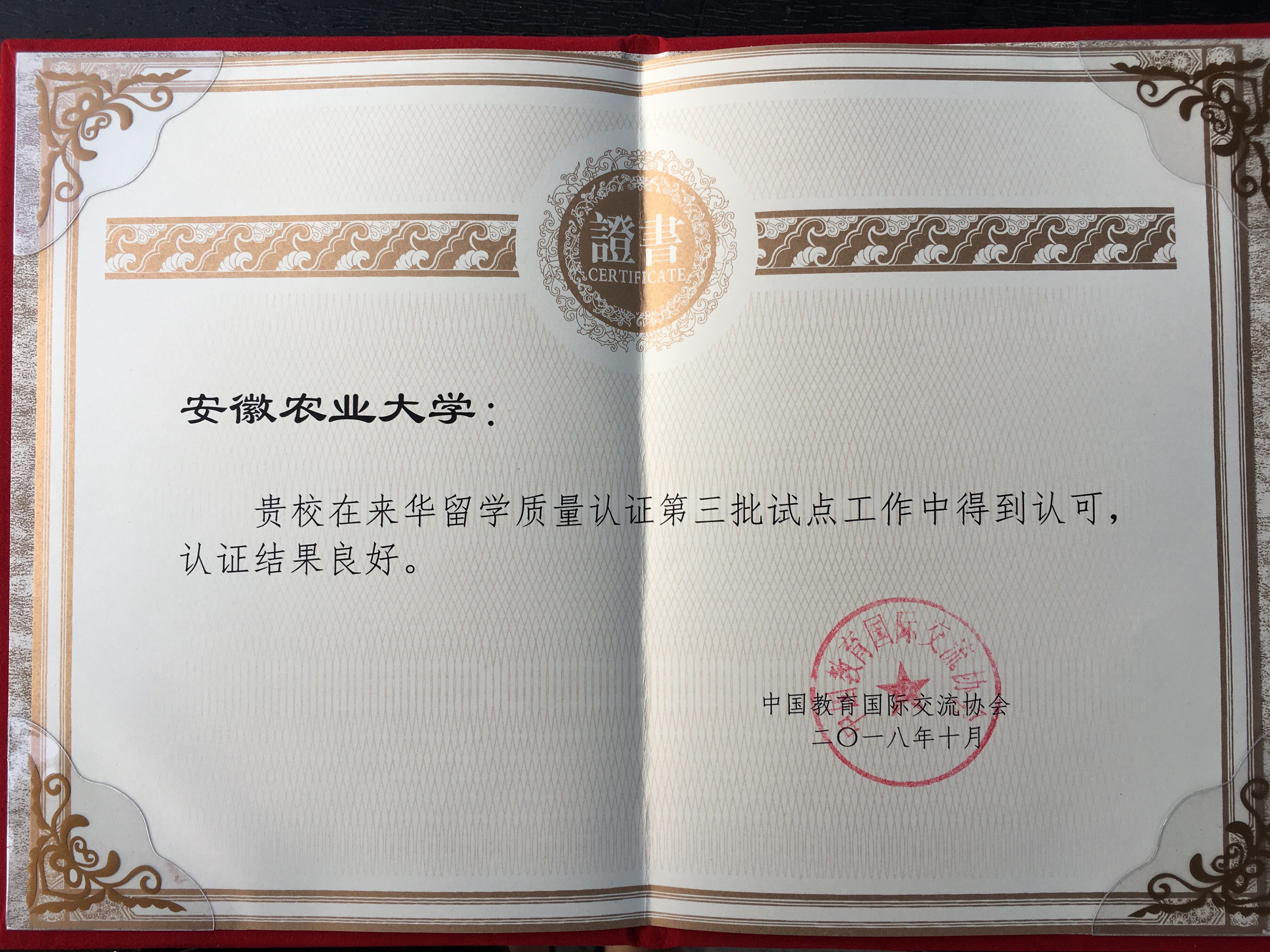 10月18日,受教育部国际司委托,由中国教育国际交流协会主办的第三批来华留学质量认证工作结果发布及授牌 ( 证 ) 仪式在北京举行。在学校即将迎来九十华诞之际,我校顺利通过认证,成为第三批31多所通过认证的高校之一。国际交流合作处处长、国际教育学院院长姜红受校领导委托出席了仪式并领取了来华留学质量认证证书。