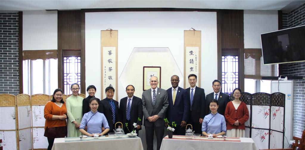 会后,程备久校长及国际交流合作处负责人陪同客人参观了我校生物科技楼、图书馆,并观赏了我校学生的茶艺表演,体验了丰富的茶文化。