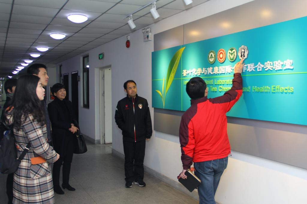 座谈会后,王德润一行参观了我校茶与健康国际联合实验室,茶与食品科技学院院长张正竹、国际交流合作处负责人及相关人员陪同参观。