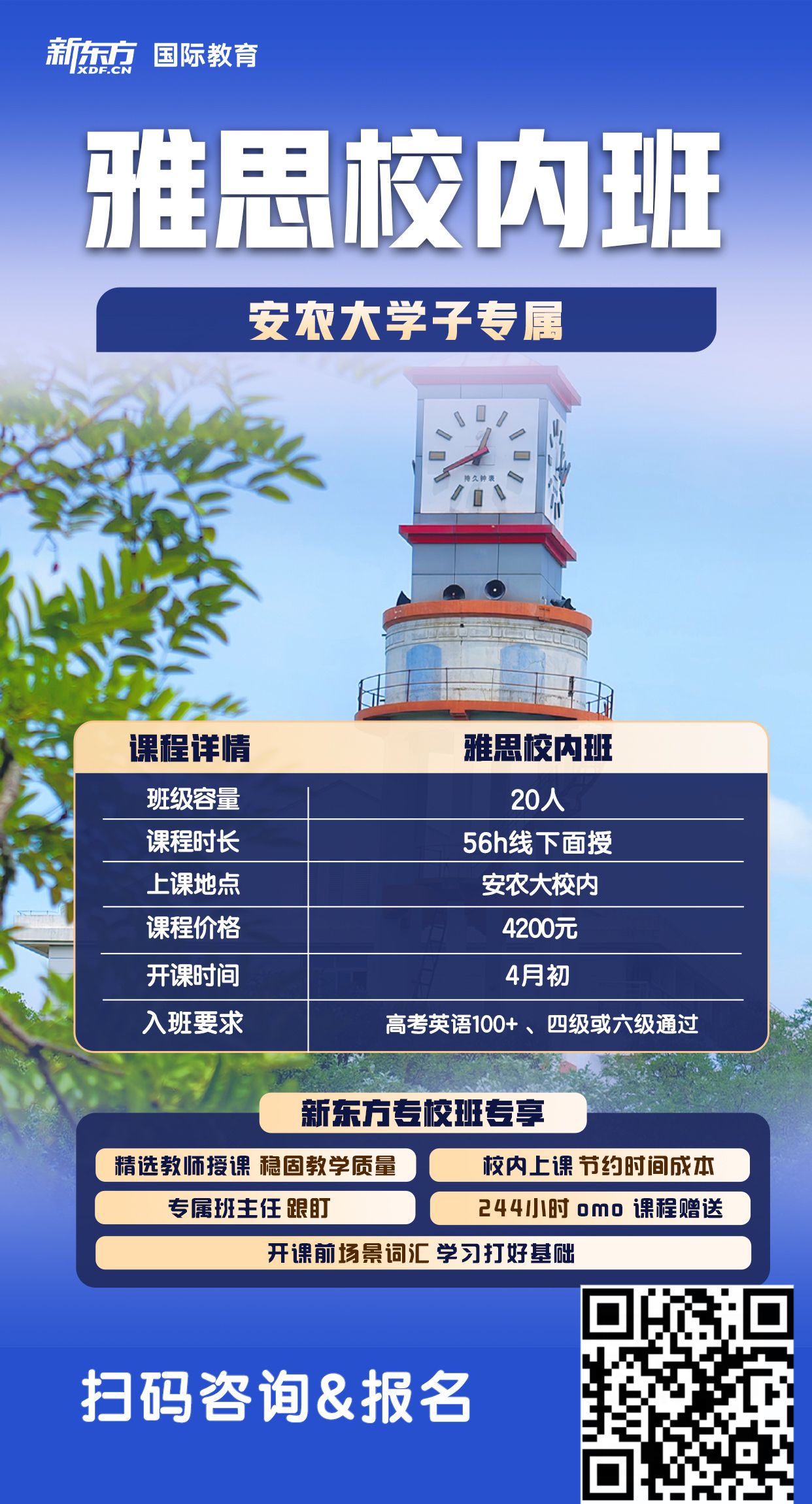 为积极响应我校国际化发展战略,服务我校国际化人才培养大局与高质量发展,营造全校浓厚的英语学习氛围,切实帮助全校学生提升英语应用能力与国际交流能力,为出国深造、访学、跨文化交流及未来职业发展奠定坚实的语言基础。现国际交流合作处联合合肥新东方国际教育,于本学期在校内开设雅思课程培训班。现将具体事宜通知如下: